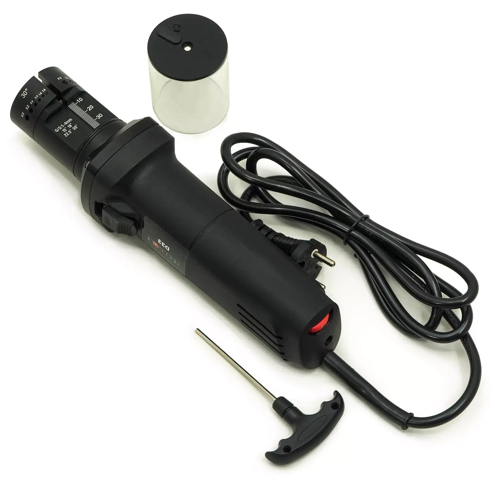 Das SPARTUS® D33 Schärfgerät ist ein kompaktes, manuelles Schärfgerät für Wolfram-Elektroden, die beim WIG-Schweißen verwendet werden. Es wird mit einem einphasigen 230V-Netz betrieben.