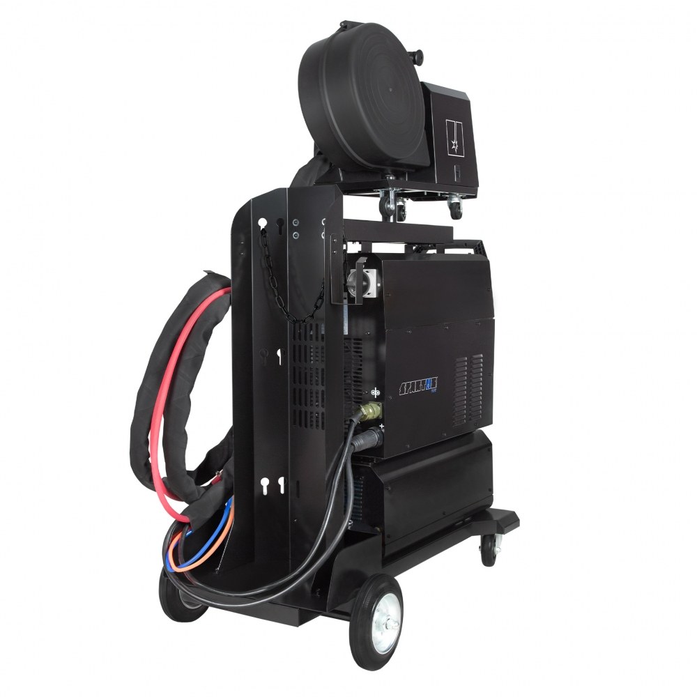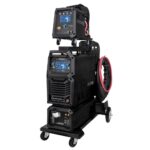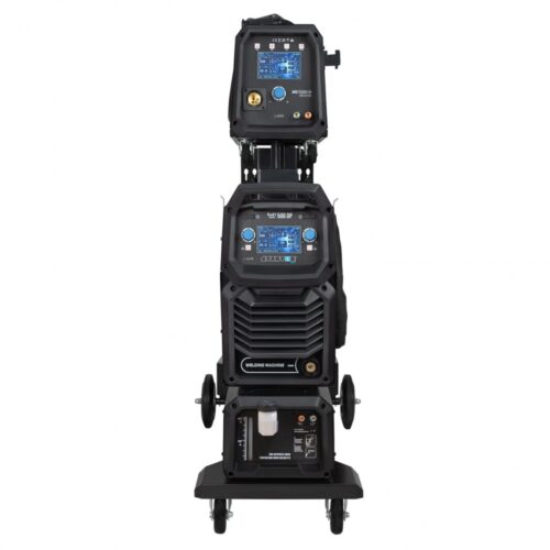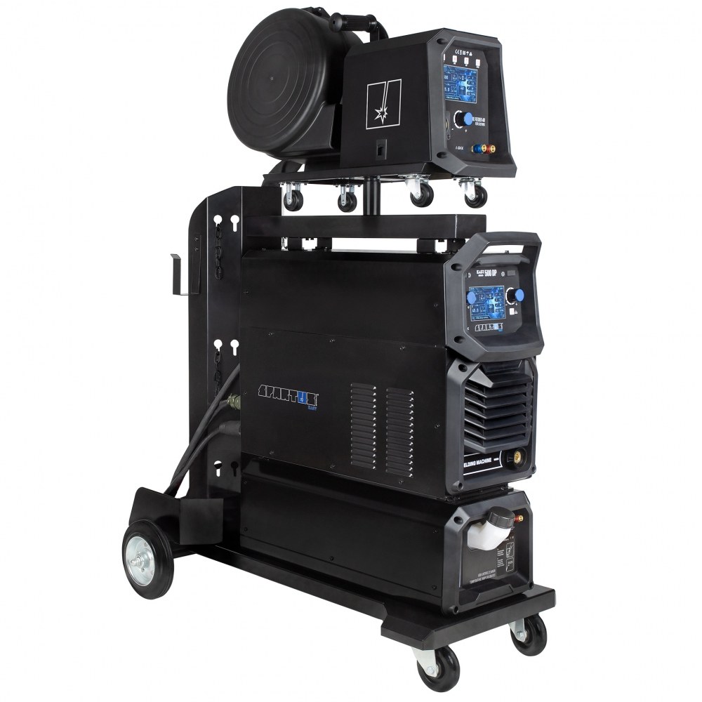 Die solide, kompakte Bauweise der SPARTUS EasyMIG 500 Dual Pulse garantiert langanhaltende Leistung auch unter schwierigen Bedingungen. Das Set ist mit einem separaten Drahtvorschub ausgestattet, was komfortables Arbeiten und einen leichteren Zugang zu den Bedienelementen gewährleistet. Zusätzlich verfügt die Maschine über einen Kühler, der die Wärme effektiv ableitet und die Lebensdauer des Geräts bei Arbeiten mit hohen Strömen verlängert. Das gesamte System ist auf einem robusten Schweißwagen mit Platz für eine technische Gasflasche untergebracht, was die Mobilität und Funktionalität des Sets erheblich steigert und ein bequemes Bewegen am Arbeitsplatz ermöglicht.