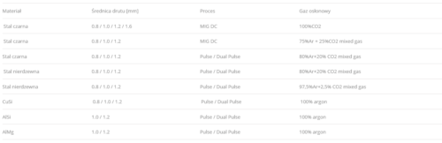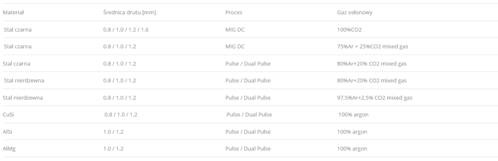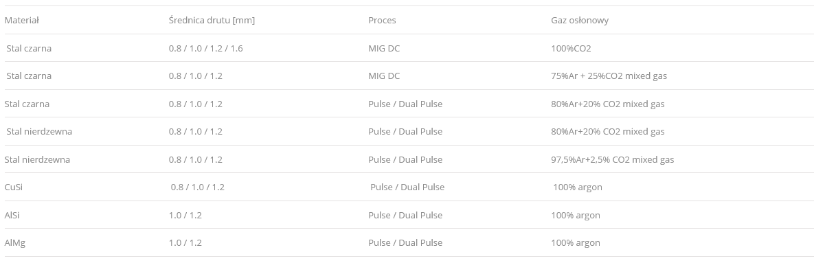 Die EasyMIG 500 Dual Pulse ist mit Synergieprogrammen für die MIG/MAG-Methoden im Drahtdurchmesserbereich von 0,8 – 1,6 mm ausgestattet, mit der Möglichkeit einer manuellen Parameterkorrektur. Zusätzlich verfügt sie über einen manuellen Betriebsmodus sowie die Möglichkeit zum Schweißen mit Fülldraht.