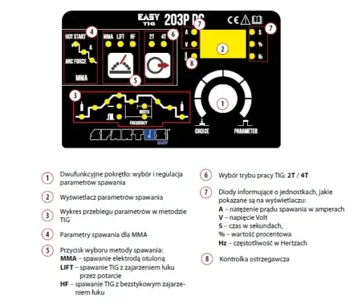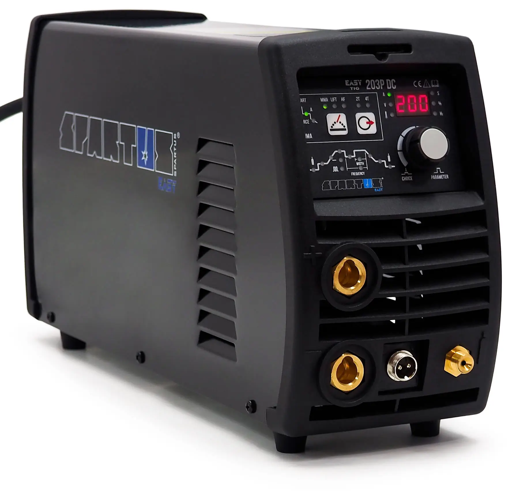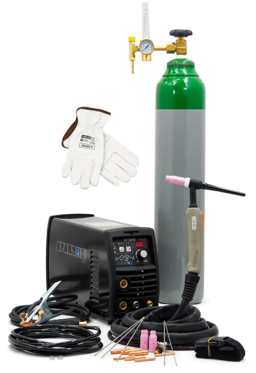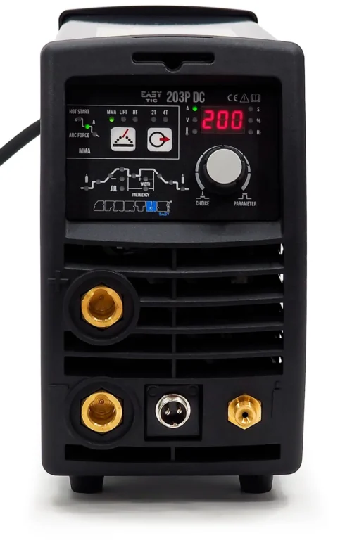Der SPARTUS EasyTIG 203P DC ist ein leichtes und einfaches Inverter-Schweißgerät, das das Schweißen mit den TIG Lift/HF- und MMA-Verfahren im Bereich von 10 – 200A ermöglicht. Es wird mit einer einphasigen 230V-Stromversorgung betrieben. Das Set enthält das Gerät SPARTUS Easy TIG 203P DC, einen TIG-Schweißbrenner TIG SPE 17 1B 4m, ein 3m-Massekabel, einen Satz Verschleißteile, einen Gasschlauch, eine Bedienungsanleitung, eine Argon-Gasflasche, einen Reduzierer mit Rotameter, X-DRIVER-Schweißhandschuhe, goldene Wolframelektroden mit einem Durchmesser von 1,6 mm, 2,0 mm, 2,4 mm, SR-26-Verbindungsstücke mit einem Durchmesser von 1,6 mm, 2,0 mm, 2,4 mm und SR-26-Klemmhülsen mit einem Durchmesser von 1,6 mm, 2,0 mm, 2,4 mm.