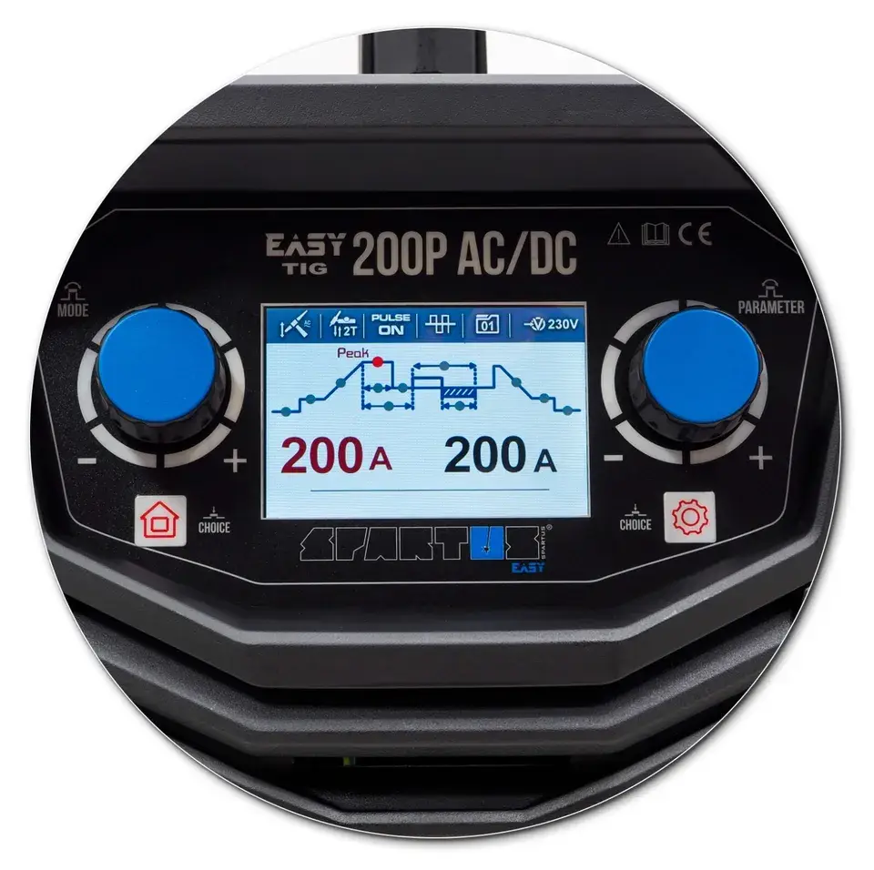 SPARTUS® EasyTIG 200P AC/DC ist ein digital gesteuertes Inverterschweißgerät, das auf der Basis von IGBT-Transistoren und PWM-Technologie aufgebaut ist. Er ermöglicht das Schweißen mit den folgenden Verfahren: WIG AC/DC und MMA AC/DC. Die Stromversorgung erfolgt über ein einphasiges 230V-Netz.Die Maschine bietet die Möglichkeit, den Lichtbogen in zwei Verfahren zu zünden, WIG HF und WIG Lift. Darüber hinaus verfügt sie über eine eingebaute Impulsschweißfunktion, die beim Fügen sehr dünner Werkstücke äußerst nützlich ist.Das einfache Funktionspanel ermöglicht die präzise Steuerung aller wichtigen Schweißparameter. Das moderne Display mit Hilfe der WIG-Funktionskurve macht es einfach, fortgeschrittene Parameter zu verwalten, wie z.B.: